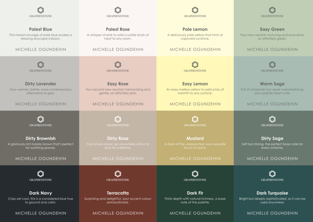 The Michelle Ogundehin x Graphenstone Collection is an edit of sixteen soothing shades lovingly crafted to be combined in any way you want — they will always work perfectly together. Designed for wellbeing, selected for ease: it’s a foundational colour palette for your entire home.